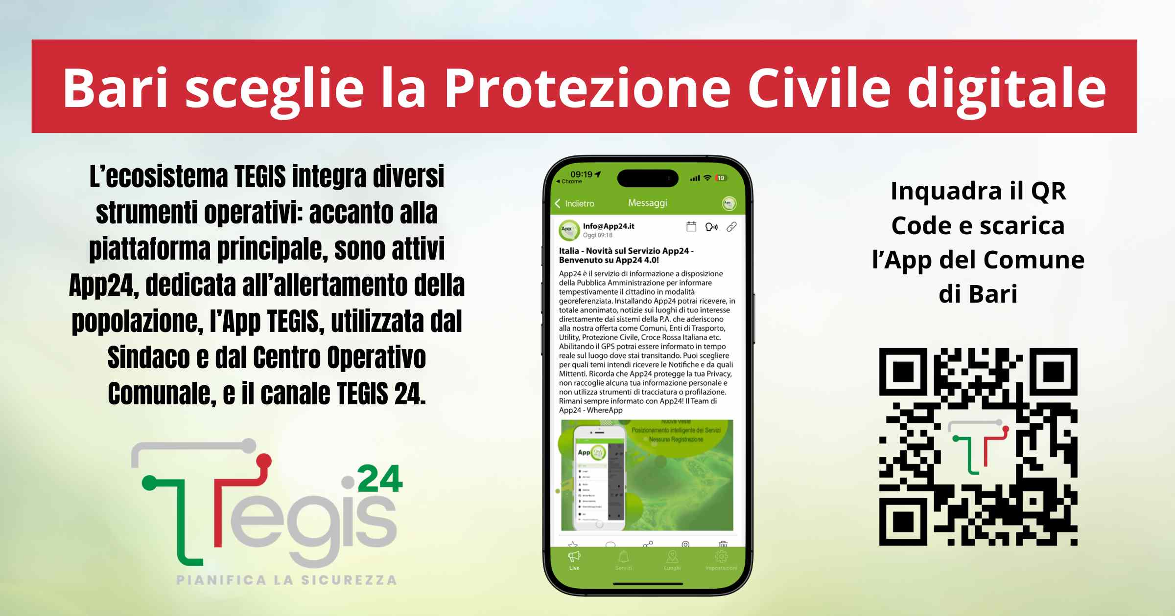 App24, scaricabile tramite QR code installati sul territorio, permette ai cittadini di ricevere informazioni utili sia in condizioni ordinarie sia durante le emergenze, consultare il Piano Nativo Digitale e ricevere messaggi di pubblica utilità e avvisi di allerta. Il sistema consente inoltre di segnalare risorse disponibili sul territorio e diffondere informazioni sanitarie e istituzionali. L’accesso non richiede registrazione né raccolta di dati personali e non prevede tracciamento, nel pieno rispetto della privacy e del GDPR.